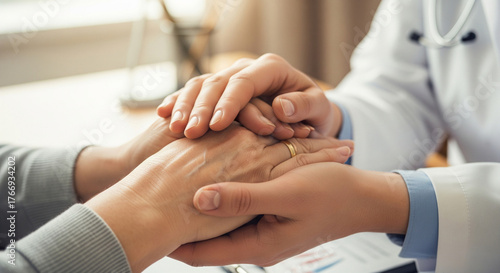 Doctor's hands gently and caringly hold patient's hands. Healthy lifestyle and medical concept