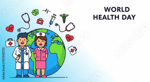 Doctors stand together on World Health Day globe