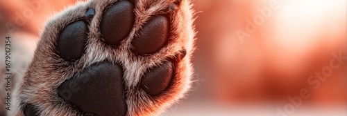 Dog paw close-up with black pads and fur on abstract warm background, symbolizing pet care, comfort, and animal companionship