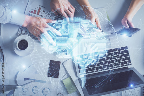Double exposure of man and woman working together and human brain hologram drawing. Brainstorm concept. Computer background. Top View.