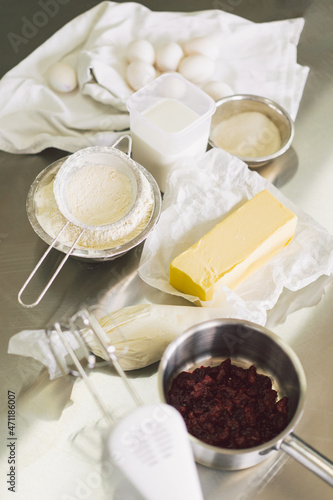 Dough preparation recipe bread, pizza or pie making ingridients. Cooking cakes. Concept ingredients for cooking flour products or dessert. Rural or rustic style.