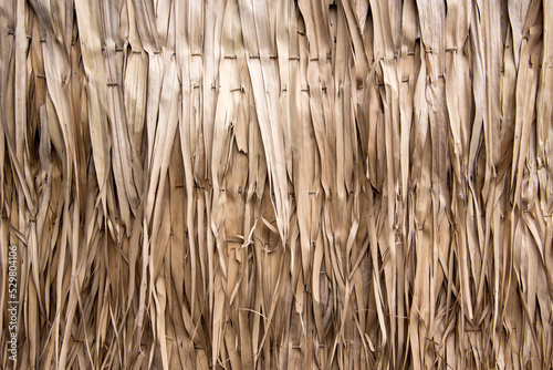 Dry palm leaves wall nature texture background. Tropical exotic design, boho decoration. Summer nature concept, space for text.