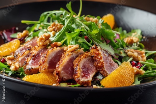 Duck breast salad with arugula orange and crushed walnuts Presented on a round black plate Classic Japanese cuisine