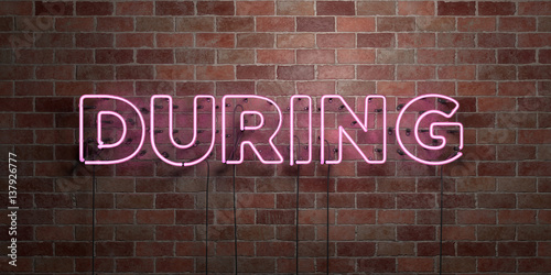 DURING - fluorescent Neon tube Sign on brickwork - Front view - 3D rendered royalty free stock picture. Can be used for online banner ads and direct mailers..