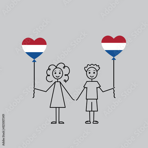 dutch children, love Netherlands sketch, girl and boy with a heart shaped balloons, black line vector illustration