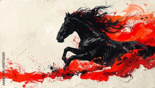 Dynamic black horse galloping with explosive red paint strokes, a powerful depiction of wild energy and freedom