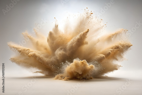 Dynamic burst of golden particles creating a captivating cloud of motion and texture against a pristine background, illustrating a powerful kinetic energy release
