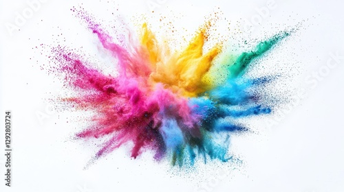 Dynamic explosion of vibrant Holi powders in mid-air, with a mix of bold colors like pink, blue, yellow, and green swirling together against a clean white background.
