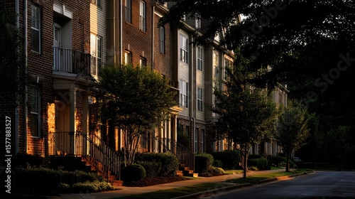 Early morning light illuminating the brick walls of uniform townhouse structures