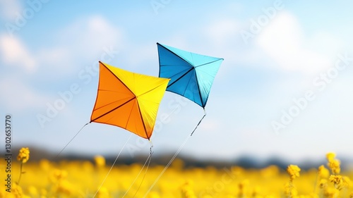 Early spring concept. Two colorful kites soar against a bright blue sky, set above a field of vibrant yellow flowers, capturing a joyful, carefree moment in nature.