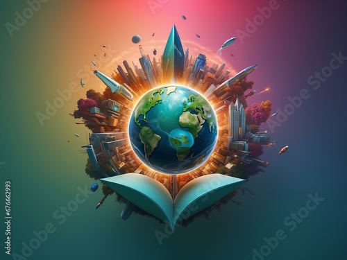 earth planet with buildings around it, blank background, for design, isolated, human effect concept