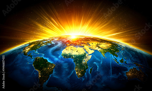 Earth, sunburst. View of continents and glowing cities. Dark blue seas, and atmosphere
