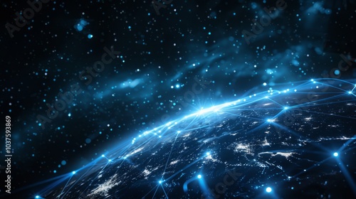 Earth surrounded by digital nodes and data streams showing global networks and blockchain technology