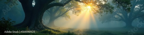 Eerie fog shrouds ancient trees, sunlight barely piercing the canopy , spooky, cold