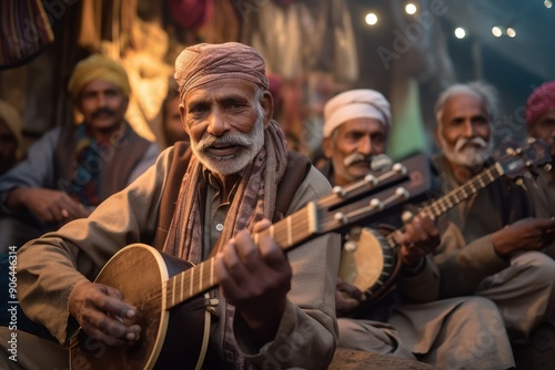 Elderly musicians playing traditional instruments in a vibrant market setting