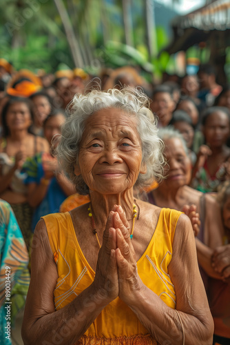 Elderly Woman in Traditional Attire Showing Respect with Hands Clasped in a Prayer Gesture Amidst a Vibrant Community Gathering in a Rural Village