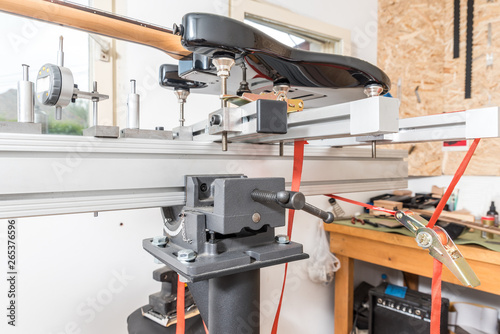 Electric guitar in handmade domestic music instrument service repair made in garage on special slider table close up selective focus