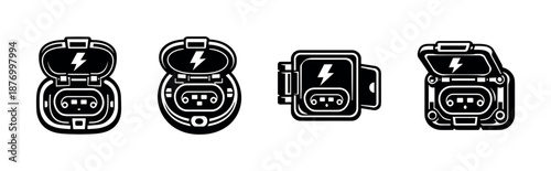 Electric vehicle charging portals vector icons set: outlets, sockets, energy symbols