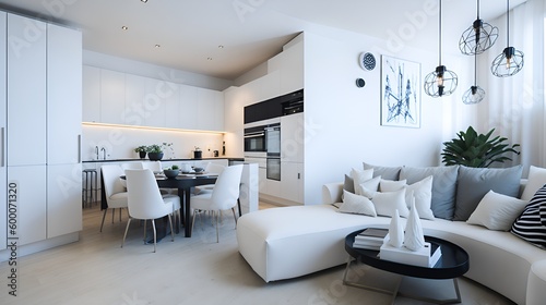 Elegant Apartment with Open Kitchen and Spacious Living Room featuring a Big White Corner Sofa