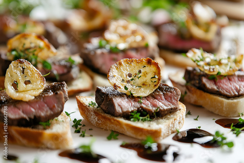 Elegant beef crostini with Parmesan crisps and balsamic drizzle, festive party table setup, close-up delicious focus