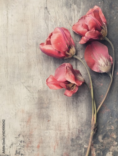 Elegant crimson tulips showcased on a textured vintage backdrop emanating refined beauty