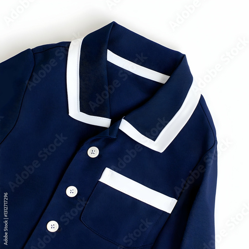Elegant Dark Blue Attire with Contrasting White Trim and Buttons
