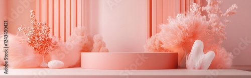 Elegant display of pastel coral and pink decor elements features soft textures and unique shapes in a serene setting