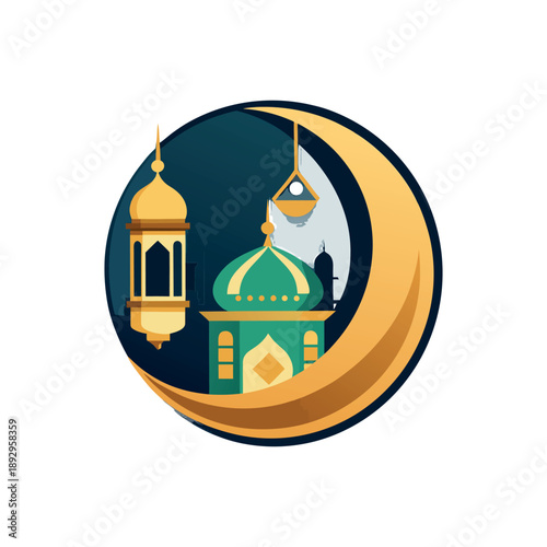 Elegant green and gold mosque logo with domes, crescent moon, and decorative symmetrical shapes, modern Islamic emblem