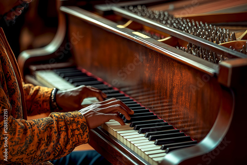 Elegant jazz performance , jazz night. Expressive fingers dance over the piano keys, creating enchanting jazz melodies in a warm and inviting atmosphere