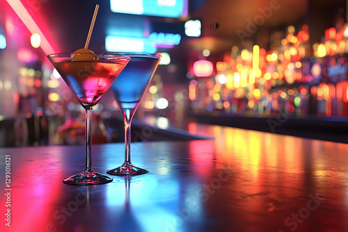 Elegant martini glasses with vibrant cocktails against a neon-lit bar backdrop, creating a sophisticated and inviting atmosphere