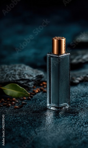 Elegant Perfume Bottle Stands on a Dark Surface With Clove Buds and Green Leaf