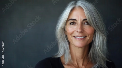 elegant portrait of a silverhaired mature woman with confident smile showcasing natural beauty and wisdom against soft diffused lighting