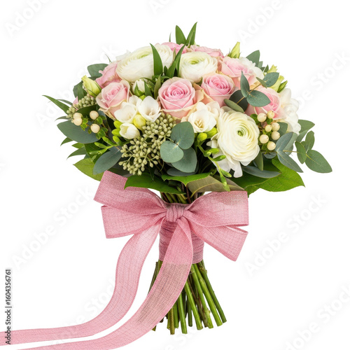 Elegant Round Wedding Bouquet with Pink Roses and Ranunculus Isolated on White Background
