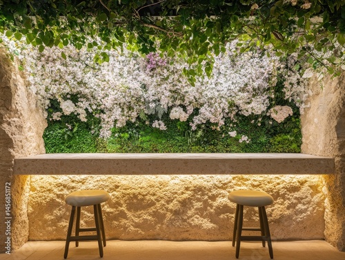 Elegant, stone-walled interior design with a floral wall.
