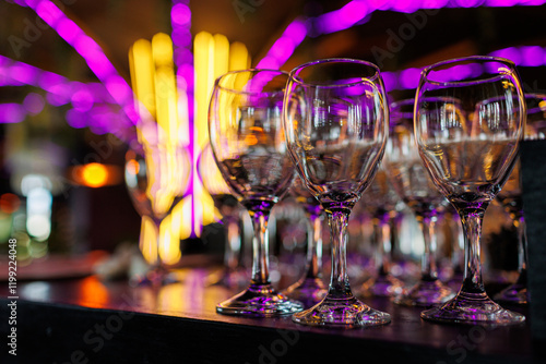 Empty clear wineglasses stand in rows on bar counter at nightclub, blurred purple neon and yellow lights on background. Clean cocktail glasses ready for celebrate party.