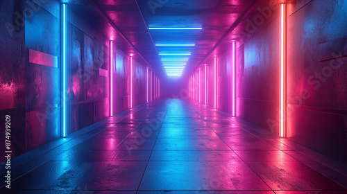 Empty futuristic corridor background tunnel studio stage construction neon lights graphic glow purple blue bright virtual sci-fi futuristic 3D rendering illustration