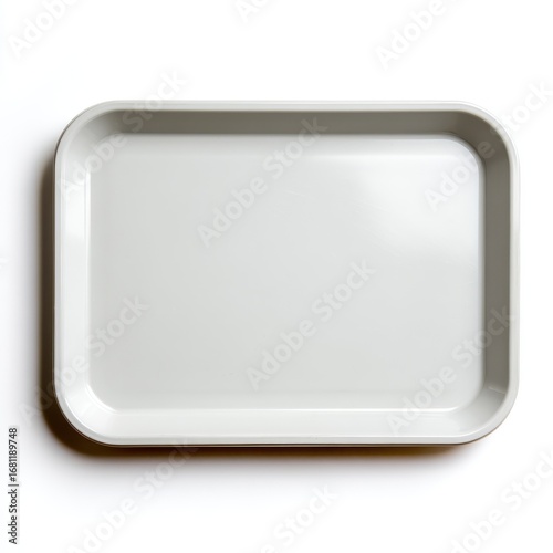 Empty gray tray on white background studio shot minimalist style top view clean surface simple design food service
