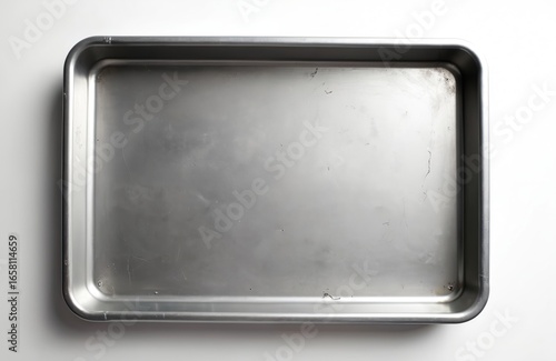 Empty rectangular metal tray, top view on white background. Stainless steel baking dish, clean, shiny, metallic surface. Kitchen utensil for food preparation, serving, baking, or medical applications.