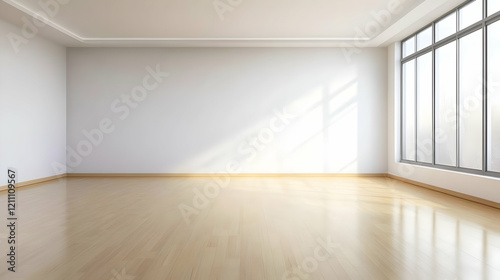 Empty Room with Light Wood Floor and Large Window Illuminates the Space Brightly and Serenely.