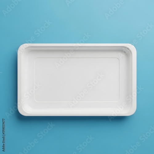 Empty white rectangular food tray on a vibrant blue background.