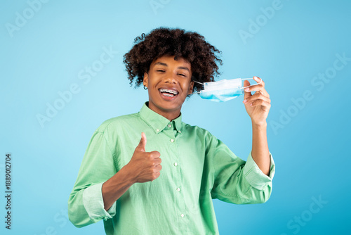 End of coronavirus pandemic. Excited black teenager taking off face mask gesturing thumbs up over blue background. Covid-19 recovery, successful medical treatment concept