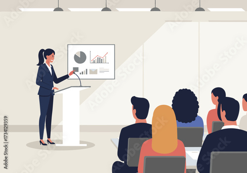 Engaging business presentation by female speaker conference room digital insights professional environment audience perspective