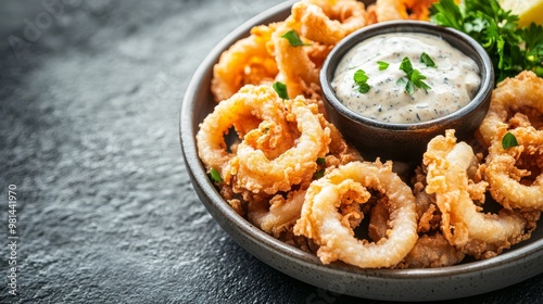 Enjoying perfectly fried golden calamari paired with a creamy dipping sauce and fresh herbs