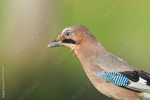 Eurasian Jay (Garrulus glandarius) close-up portrait with green background – common species in the Czech Republic