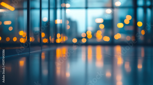 Evening reflections on a city building floor with glowing lights in the background