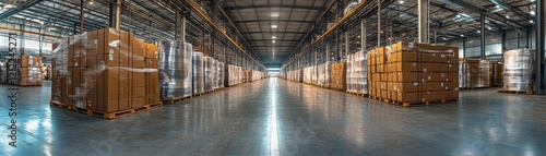 Expansive Modern Warehouse Interior with Stacked Cardboard Boxes and Industrial Shelving in a Vast Storage Facility