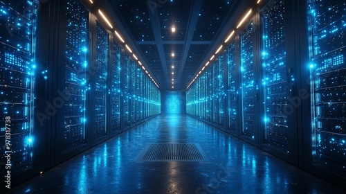Expansive Server Room with Glowing Blue Lights Highlighting Depth and Connectivity in High-Tech Space