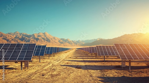 Expansive Solar Panel Installation in a Desert Landscape Under a Clear Blue Sky at Sunset, Showcasing Renewable Energy in a Beautiful Natural Setting