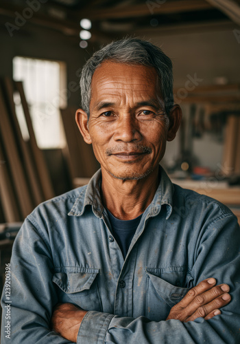 Experienced carpenter with a subtle smile is captured in his workshop with his arms folded