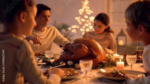 Family Dinner with Roast Turkey. A joyful family gathered around a Christmas table with a golden roast turkey centerpiece, capturing the warmth of holiday feasting